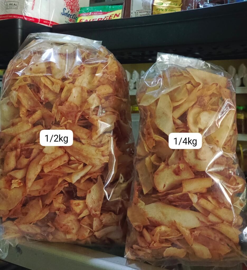 - Penirisan minyak dan pengemasan higienis agar kripik tetap renyah dan awet.